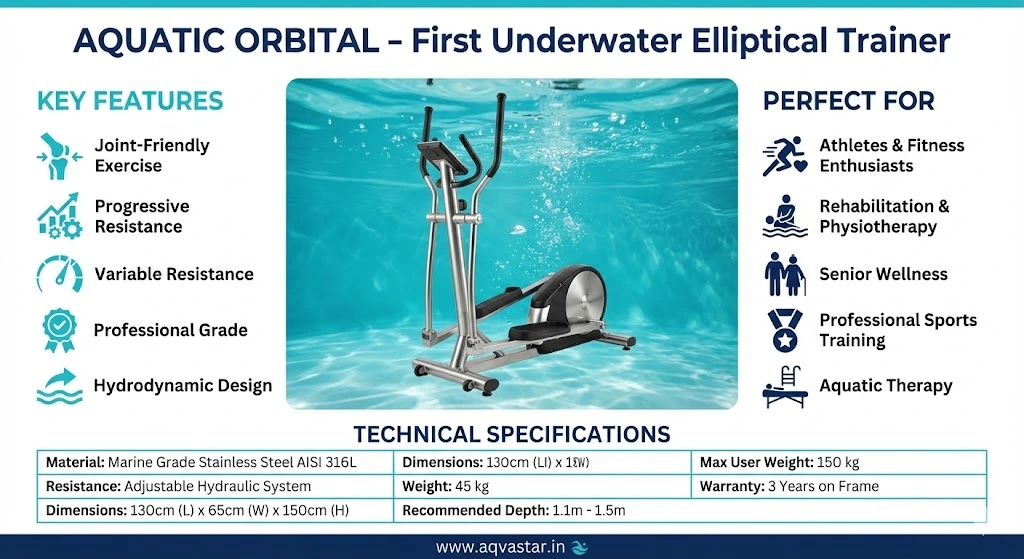 Aquatic Orbital is a professional underwater elliptical training system designed to provide a smooth, continuous, and low-impact workout. Developed through hydrodynamic and biomechanical research, the Aquatic Orbital converts water resistance into progressive elliptical movement, offering effective cardiovascular and muscular training. The buoyancy of water reduces body weight and joint pressure, allowing free and natural movement that is safe for knees, hips, and ankles. This makes Aquatic Orbital an ideal solution for rehabilitation therapy, senior wellness programs, and professional sports training. Constructed for intensive professional use, Aquatic Orbital is widely installed in aquatic therapy centers, rehabilitation clinics, fitness facilities, and sports recovery programs. It supports endurance training, muscle strengthening, and full-body conditioning in a safe aquatic environment. Key Features: • Joint-friendly elliptical movement • Progressive water resistance • Professional-grade construction • Cardiovascular and muscular training • Suitable for rehabilitation and sports therapy For pricing and customized solutions, please contact our team.