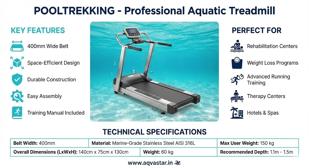 PoolTrekking is a professional-grade aquatic treadmill engineered for durability, performance, and therapeutic effectiveness. Designed for underwater use, it allows walking and running exercises in a controlled aquatic environment, significantly reducing joint impact while improving strength, balance, and cardiovascular endurance. With a wide treadmill belt and robust construction, PoolTrekking ensures stability and safety for users across all fitness levels. The natural resistance of water enhances muscle engagement while minimizing stress on knees, hips, and the lower back, making it an excellent solution for rehabilitation therapy, weight-loss programs, and advanced athletic training. PoolTrekking is widely used in rehabilitation and physiotherapy centers, fitness and wellness facilities, hotels, spas, and sports training programs. It is an ideal solution for post-injury recovery, mobility improvement, and professional aquatic fitness training. Key Features: • Professional underwater treadmill system • Low-impact walking and running exercises • Durable and stable construction • Ideal for rehabilitation and weight management • Suitable for clinical and commercial use For pricing and customized solutions, please contact our team.